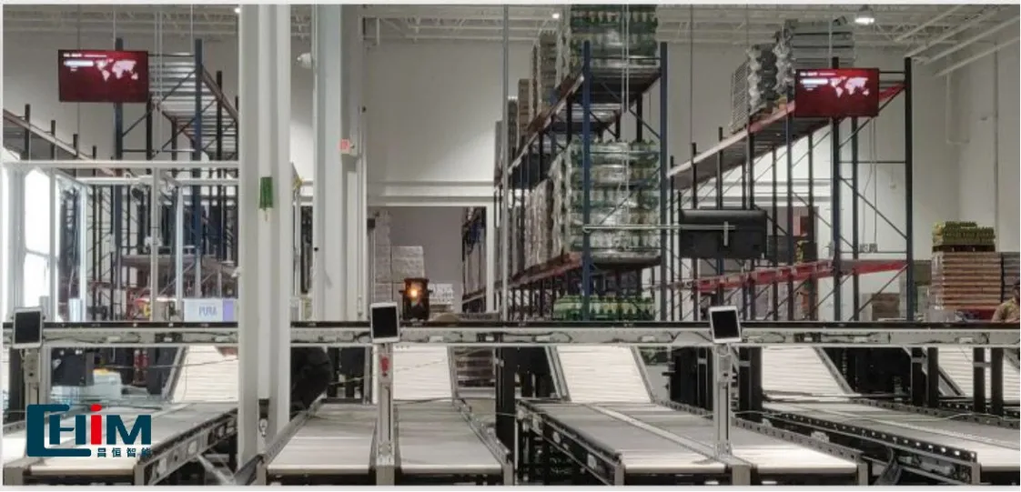 Nhân viên làm theo hướng dẫn ánh sáng nhãn điện tử trên các kệ cao để kiểm tra hàng hóa và đặt chúng vào bốn đường lăn điện tuyến tính chạy qua hai kệ kho.