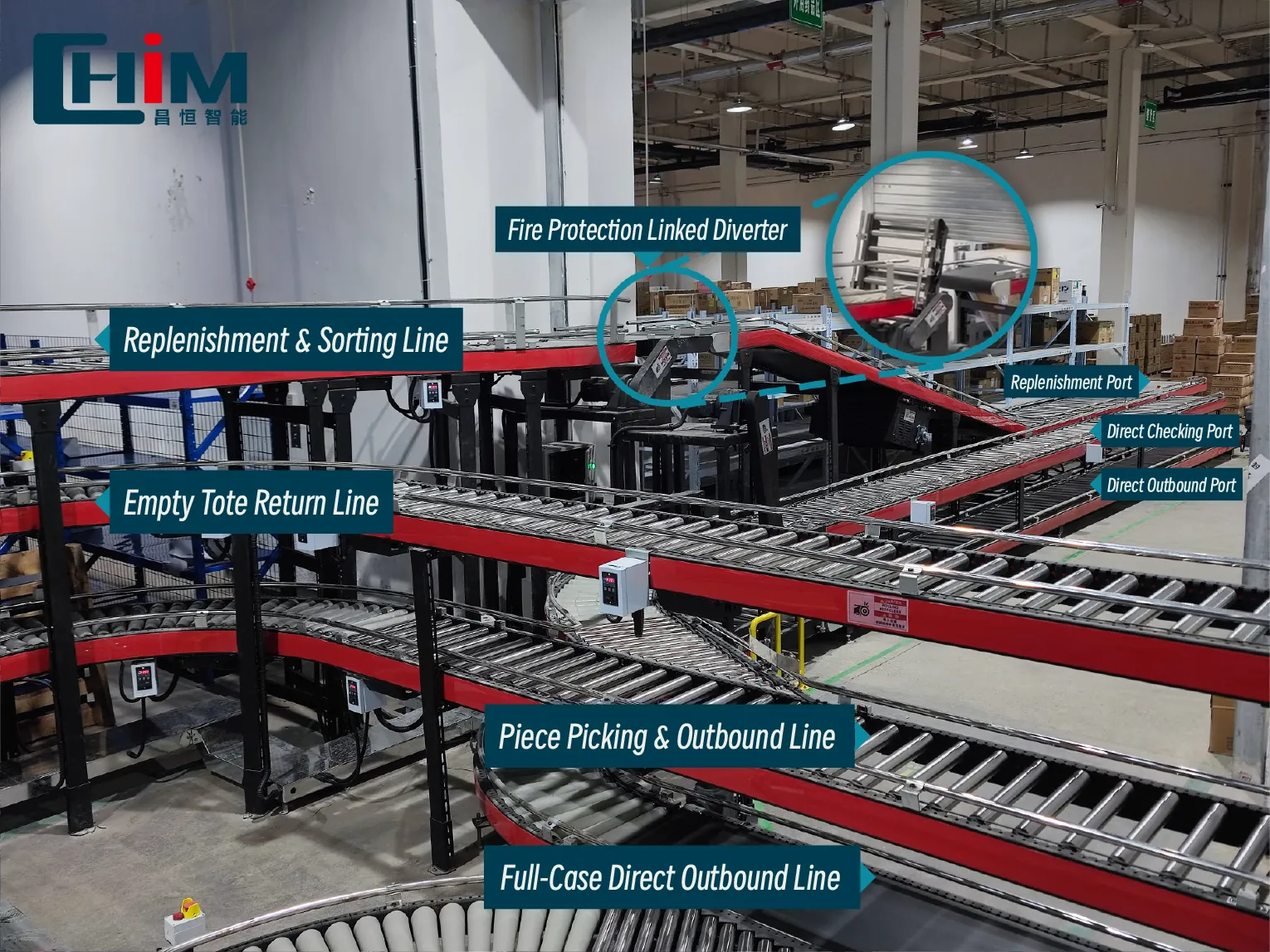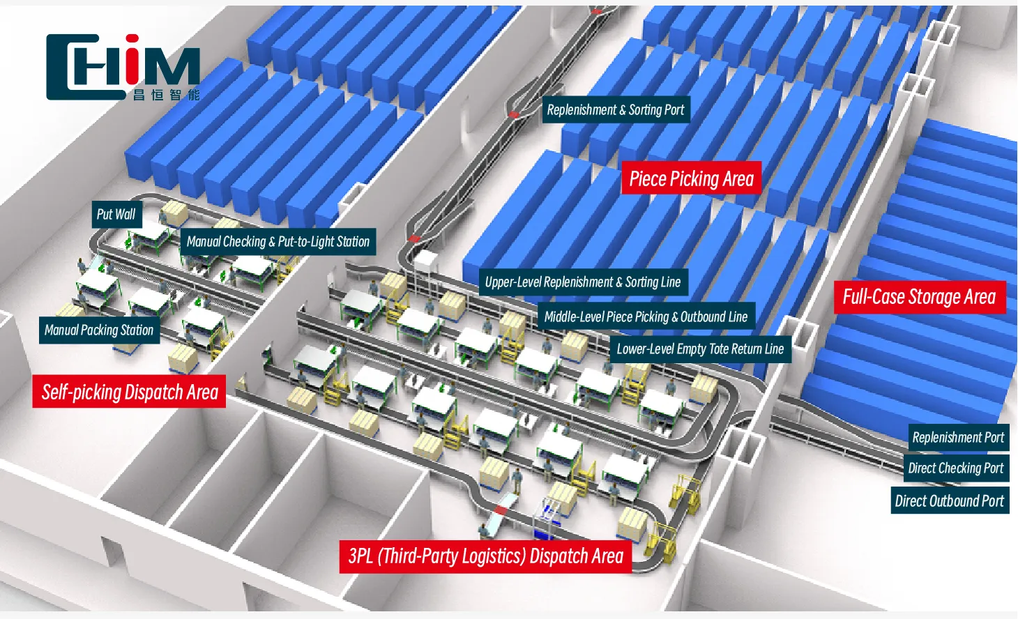 Thông qua giải pháp khu vực liên kho, Changheng Intelligent đã đạt được nhiều hoạt động như chọn toàn bộ, bổ sung và chọn từng mảnh trong khi đảm bảo rằng không gian lưu trữ chiếm hơn một nửa diện tích. Nhiều đường phân loại song song cung cấp dung lượng lưu trữ lớn hơn trong một không gian hạn chế đồng thời nâng cao hiệu quả hoạt động.