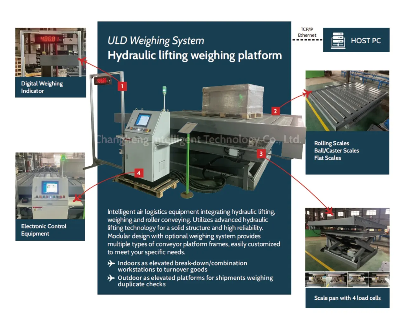 Hệ thống vận chuyển và cân ULD thông minh Changheng được thiết kế để đáp ứng các yêu cầu về an toàn và hiệu quả của việc vận chuyển hàng hóa bằng đường hàng không, giúp các nhà ga hàng không tải, dỡ và vận chuyển hàng hóa ULD một cách chuẩn hóa.